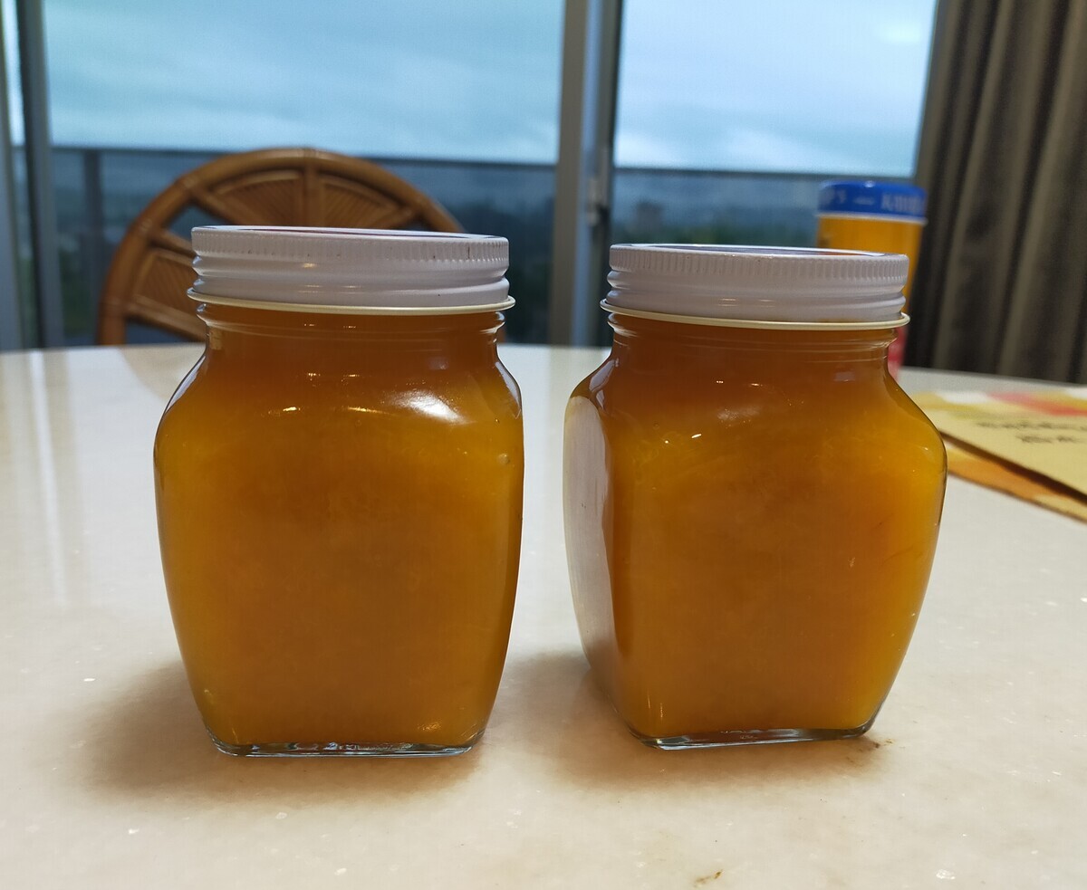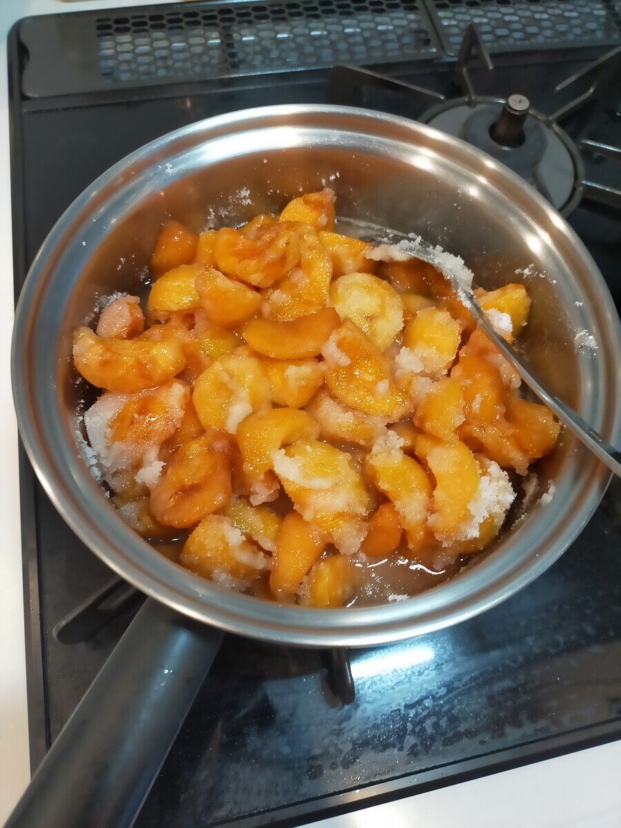 昨日の写真の杏子の量で2瓶の杏子ジャムが出来ました
